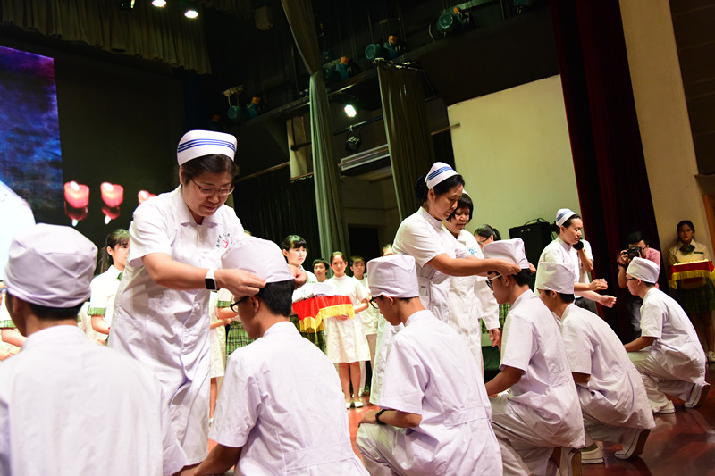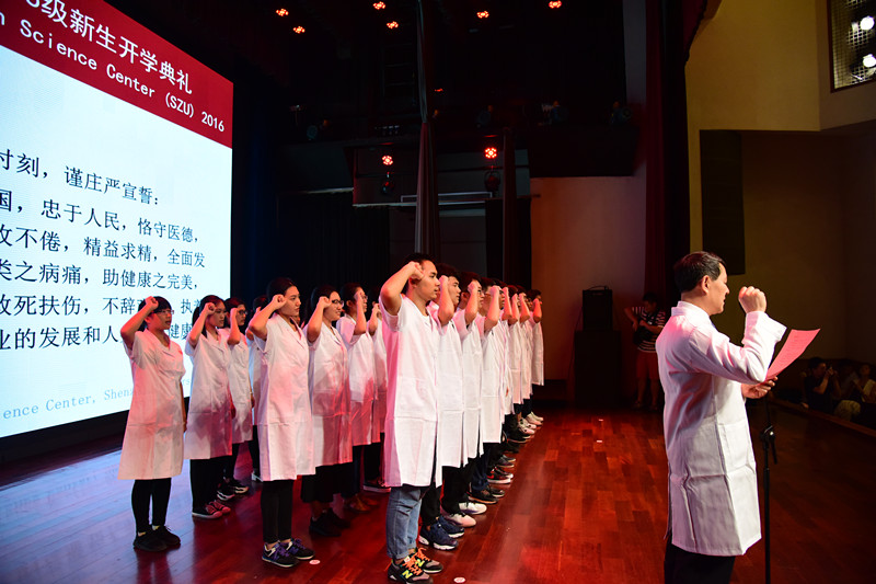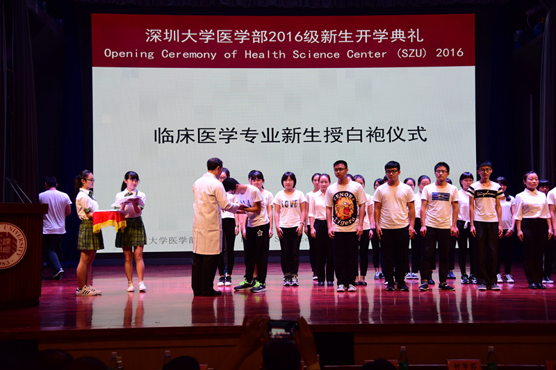 球盟会QMH(中国)官方网站 2009年开始,保持了为临床医学专业的新生授白袍仪式,希望以此激发医学生的使命感和责任感,激励学生们弘扬救死扶伤的人道主义精神。杨宝峰院士为2016级临床医学专业的新生授予白袍并带领新生进行宣誓。为适应深圳市护理专业人才的大量需求,今年球盟会QMH(中国)官方网站 首次招收护理学专业新生,本次护理学专业在广东省第二批次招生,共计招生174人。典礼上, 广东省护理学会副理事长、南丁格尔奖获得者钟华荪主任护师、南山医院护理副院长莫蓓蓉主任护师、深圳大学第一附属医院护理部主任谢小华主任护师以及球盟会QMH(中国)官方网站 护理学院院长王惠珍主任护师为 首批护理专业新生进行 授帽仪式 ,新生们庄严宣誓为护理事业贡献力量。