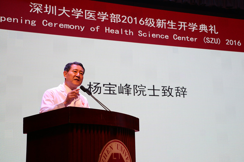 典礼由医学院副院长范新民主持。 杨宝峰院士在致辞中谈到,深圳发展的速度、思想和理念都是中国文化和社会发展的结晶,深大 33年发展取得的成就也让世人刮目相看。尤其近些年在获得国家自然科学基金项目方面,深大全国位列30名,更是体现了建设高水平大学,这与学校重视科技研究,重视医疗科学人才的培养是分不开的。他向同学们提了四点希望:珍惜时光,树立远大理想,有鸿鹄之志;要有大爱精神和同情心;要有锲而不舍,金石可镂的坚韧意志;要具备创新意识和进取心。