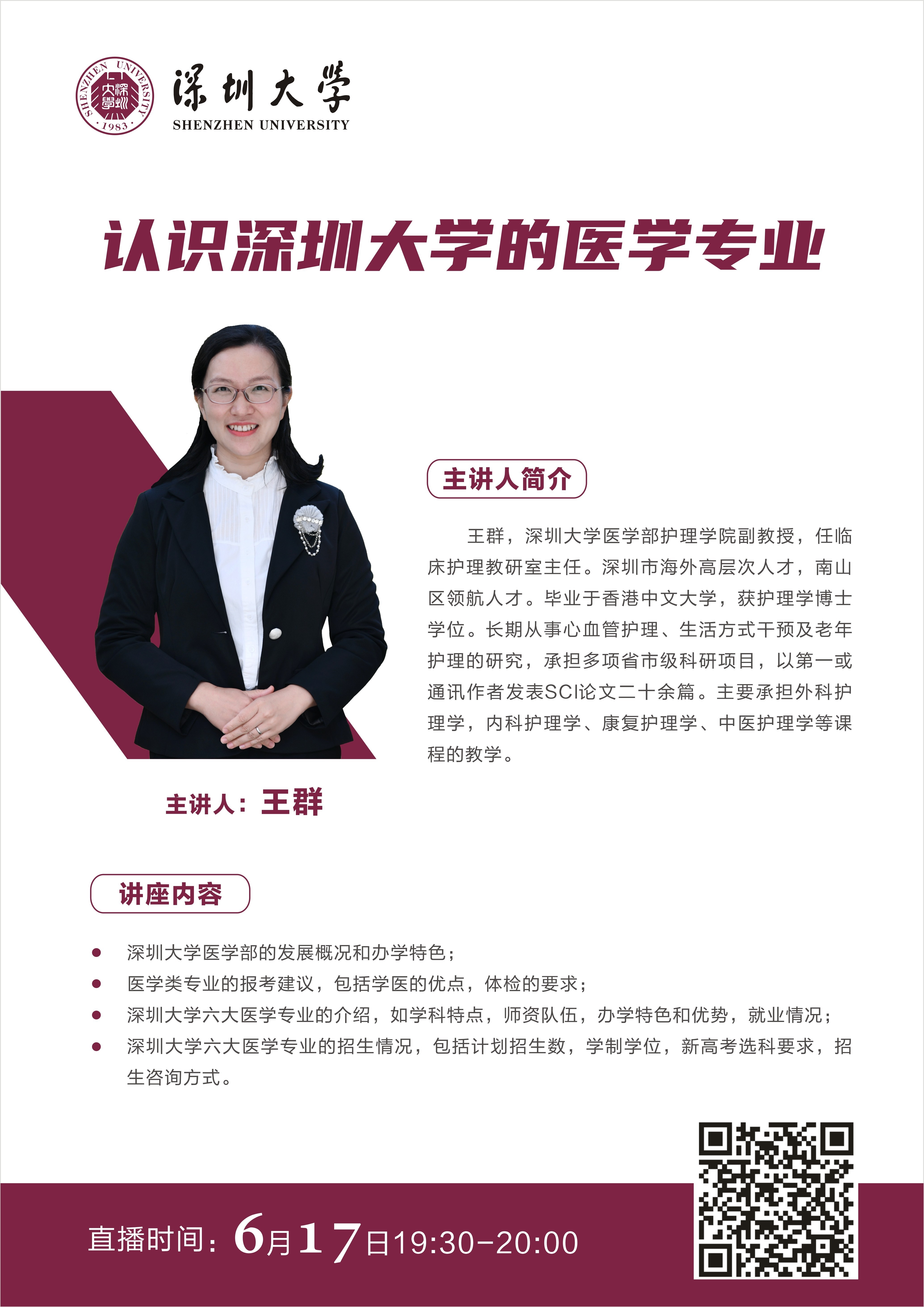 直播预告 | 球盟会QMH(中国)官方网站 专业宣讲 来源: 发布时间:2021-06-16 18:02:37 浏览次数: 次 【字体:小 大】 球盟会QMH(中国)官方网站 目前有6个专业:临床医学,生物医学工程,药学,口腔医学,预防医学和护理学。 6月17日19:30-20:30,王群副教授为大家介绍球盟会QMH(中国)官方网站 各专业,欢迎大家关注收看。直播二维码,扫码观看:球盟会QMH(中国)官方网站 招生咨询电话:0755-86671923 点赞 收藏 分享到: 【打印正文】