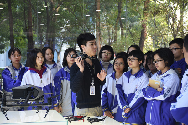 3月10日上午,师生们参观了深圳市大疆创新科技有限公司。工作人员在展览厅向同学们展示并讲解了便携式“精灵”拍摄无人机、“灵眸”空中摄像机、“晓”系列无人机、“经纬”系列高性能飞行平台等产品,并向随行的中学老师宣讲了大疆推出的“RoboMaster”机器人实践教育平台。该平台本着“创新人才的培养,从基础教育落地开始”的理念,从“文化”、“教育”、“比赛”三个模块经营,与高中开展机器人教学合作。