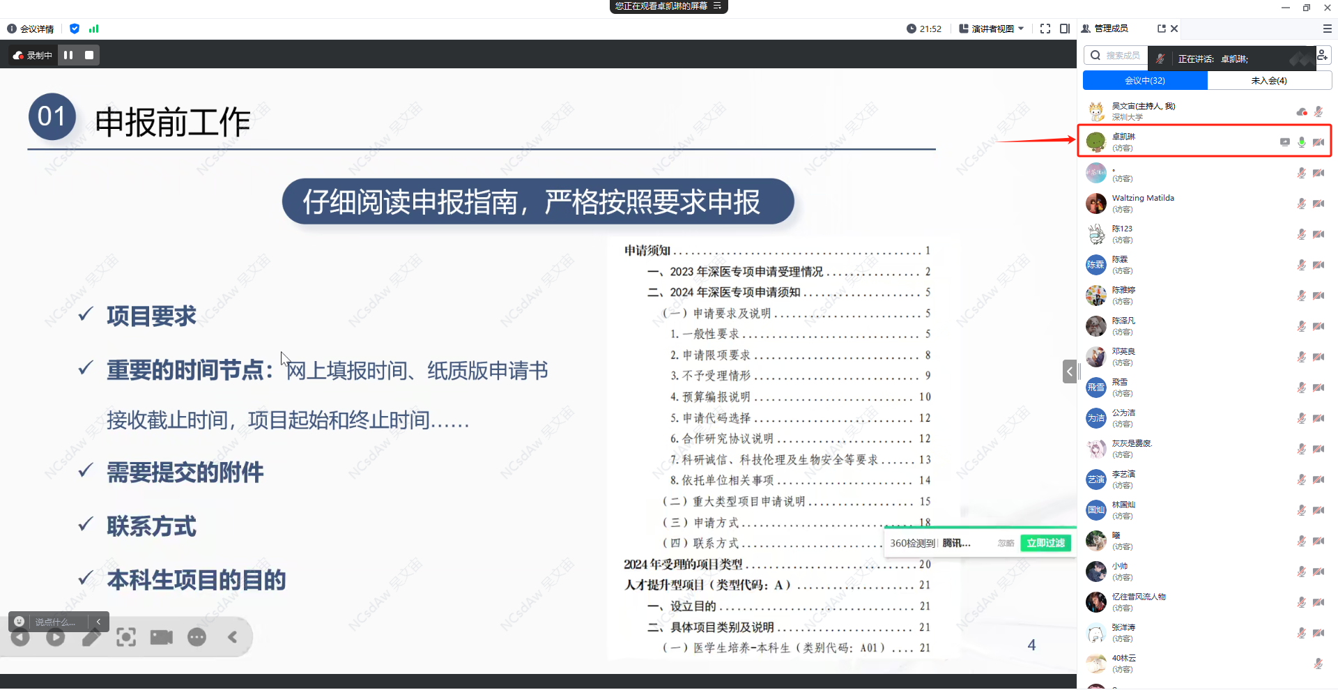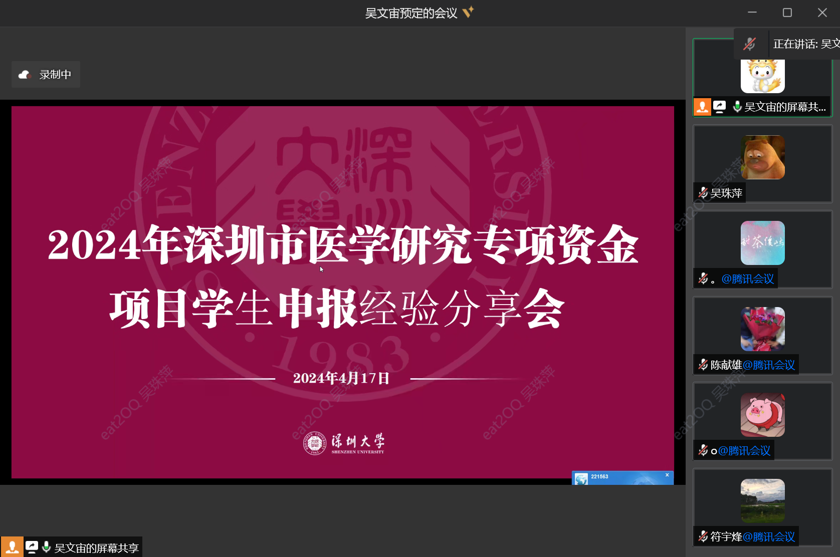 2024年4月17日下午,由医学教育发展中心举办的第十九期“医路师道”沙龙——深圳市医学研究专项资金项目学生申报经验分享会在线上顺利举行。此次会议邀请了2023年立项医学研究专项资金项目(深圳市医学科学院的项目)-本科生类型项目的2021级临床医学专业的学生卓凯琳同学分享申报经验,参会人数有30余人。