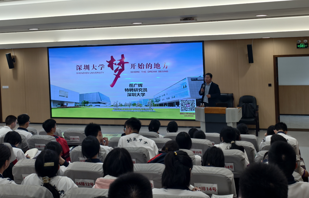 在下半场,岳广辉首向同学们介绍了深圳大学的学校概况、师资力量、学科建设、培养特色、招生政策、学习环境、生活环境等方面的内容,并欢迎有意向的学生积极报考深圳大学,继续学习,用知识武装头脑,用行动实现梦想。