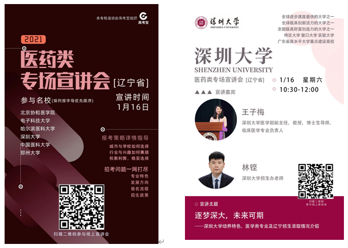 为了帮助广大考生足不出户了解深圳大学医药类招生政策,掌握权威招考资讯,提前做好志愿填报规划,2021年1月16日10:30-12:00球盟会QMH(中国)官方网站 进行了线上招生宣讲活动。本次活动是在深圳大学招生办公室组织下,以“高考宝”为平台开展的,本场是宣讲活动的第一场,重点针对辽宁考生和家长,同时面向全国高中生进行宣讲直播。