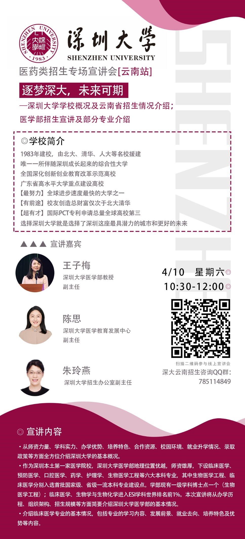 伴随着越来越清晰的高考脚步声,为帮助考生及家长更好地了解深圳大学和相关招生政策,更好地认识医学专业,4月10日上午,球盟会QMH(中国)官方网站 在高考宝平台开展了云南省线上直播招生宣传活动。球盟会QMH(中国)官方网站 副主任王子梅教授、招生办公室副主任朱玲燕老师,医学教育发展中心陈思老师负责主讲。本次活动在高考宝平台开展直播,吸引了300余名云南省的考生及家长在线观看。