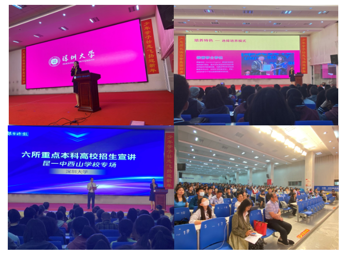 4月24日上午,昆明都市时报联合云南升学网,邀请到深圳大学等6所重点本科高校到昆一中西山学校进行宣讲,采取“线上+线下”的方式,向高三学生和家长进行“面对面”服务。昆一中西山学校马校长开场致辞时表示,六所重点本科高校的到来,让高三学子有幸提前接触到优质高校的招生政策及相关报考信息,为学生高考结束之后高效择校提供了基础,对成就更好的人生意义重大。