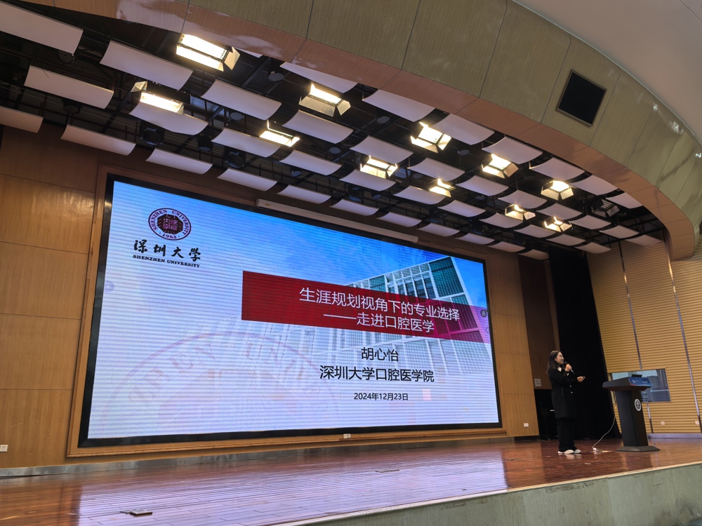 近日,在口腔医学院的组织下,“名师进中学”活动走进华中师大龙岗附属中学。球盟会QMH(中国)官方网站 胡心怡老师为该校高一年级500余名同学带来了一场名为《生涯规划视角下的专业选择:走进口腔医学》的精彩讲座,受到了华中师大龙岗附属中学老师和同学