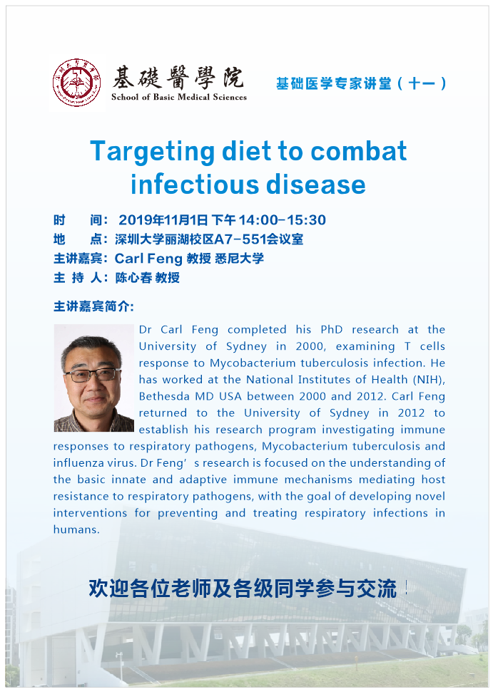 基础医学专家讲坛(十一)Targeting diet to combat infectious disease 发布时间:2019-10-25 点击数: 次 【字体:小 大】 点赞 收藏 分享到: 打印正文 关闭本页