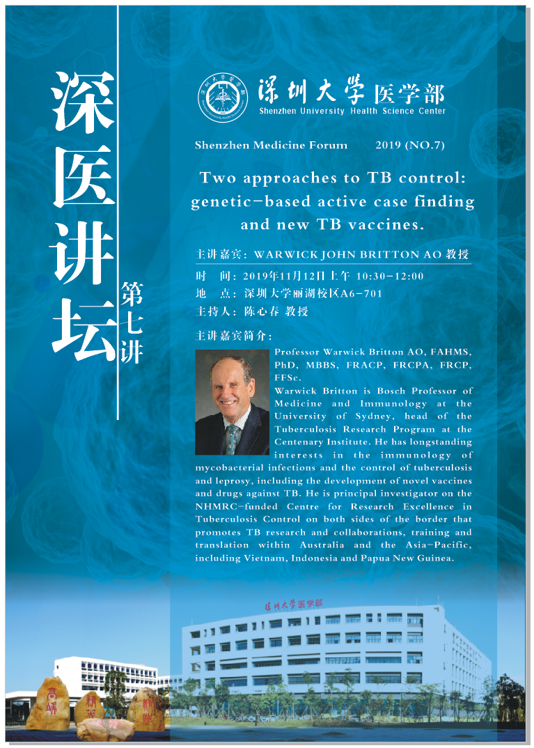 深医讲坛2019(第七讲)Two approaches to TB control: genetic-based active case finding and new TB vaccines 发布时间:2019-11-11 点击数: 次 【字体:小 大】 点赞 收藏 分享到: 打印正文 关闭本页