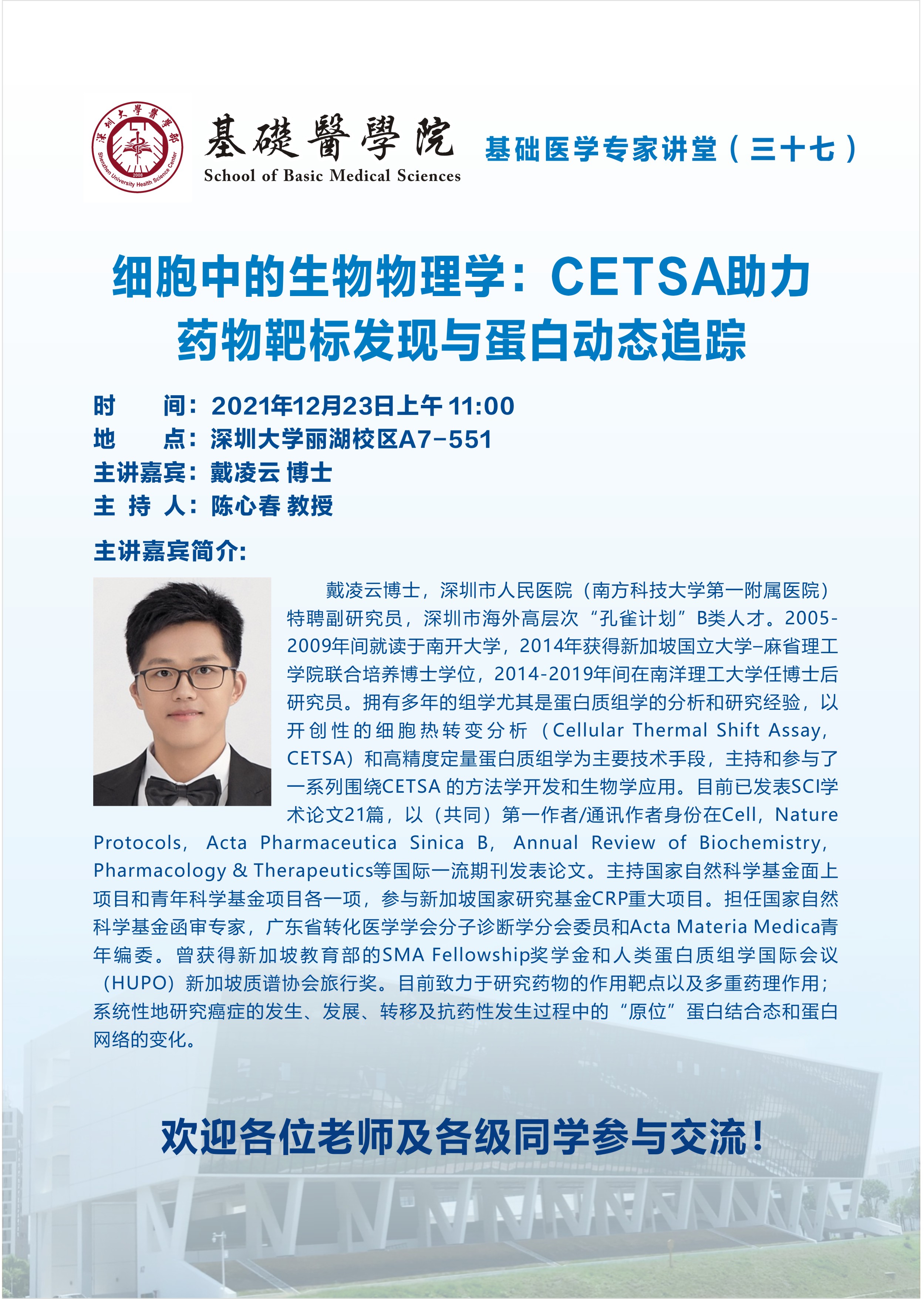 题 目:细胞中的生物物理学:CETSA助力药物靶标发现与蛋白动态追踪