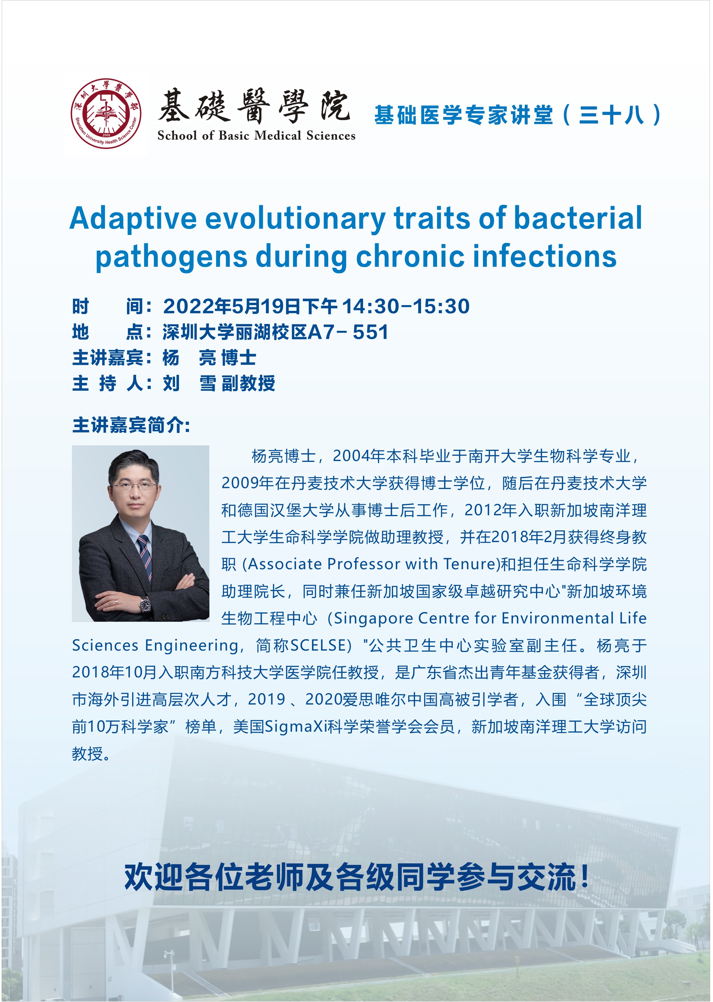 杨亮博士,2004年本科毕业于南开大学生物科学专业,2009年在丹麦技术大学获得博士学位,随后在丹麦技术大学和德国汉堡大学从事博士后工作,2012年入职新加坡南洋理工大学生命科学学院做助理教授,并在2018年2月获得终身教职 (Associate Professor with Tenure)和担任生命科学学院助理院长,同时兼任新加坡国家级卓越研究中心"新加坡环境生物工程中心(Singapore Centre for Environmental Life Sciences Engineering,简称SCELSE)"公共卫生中心实验室副主任。杨亮于2018年10月入职南方科技大学医学院任教授,是广东省杰出青年基金获得者,深圳市海外引进高层次人才,2019 、2020爱思唯尔中国高被引学者,入围“全球顶尖前10万科学家”榜单,美国SigmaXi科学荣誉学会会员,新加坡南洋理工大学访问教授。