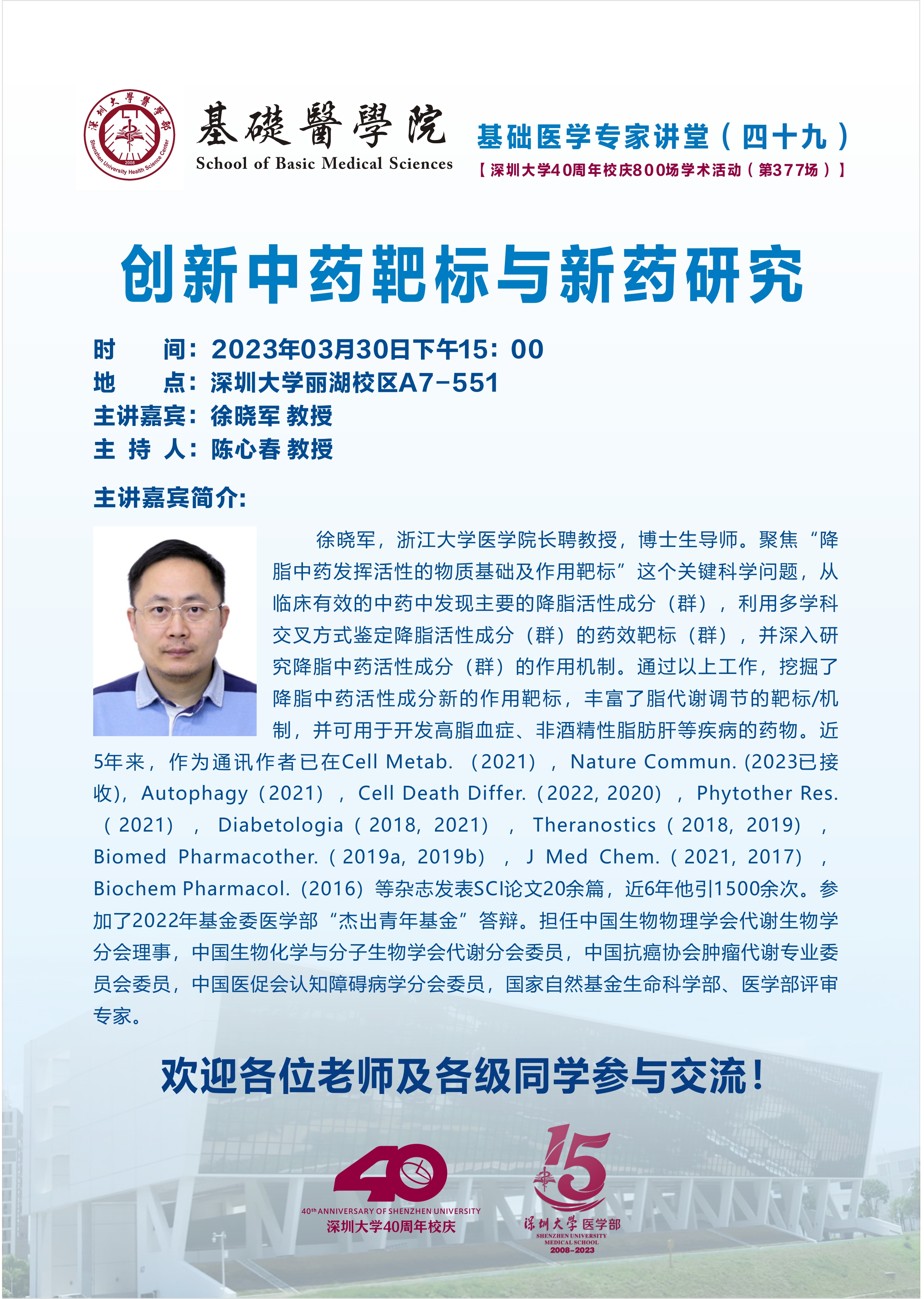 【深圳大学40周年校庆800场学术活动(第377场)+基础医学专家讲堂(四十九)】:创新中药靶标与新药研究