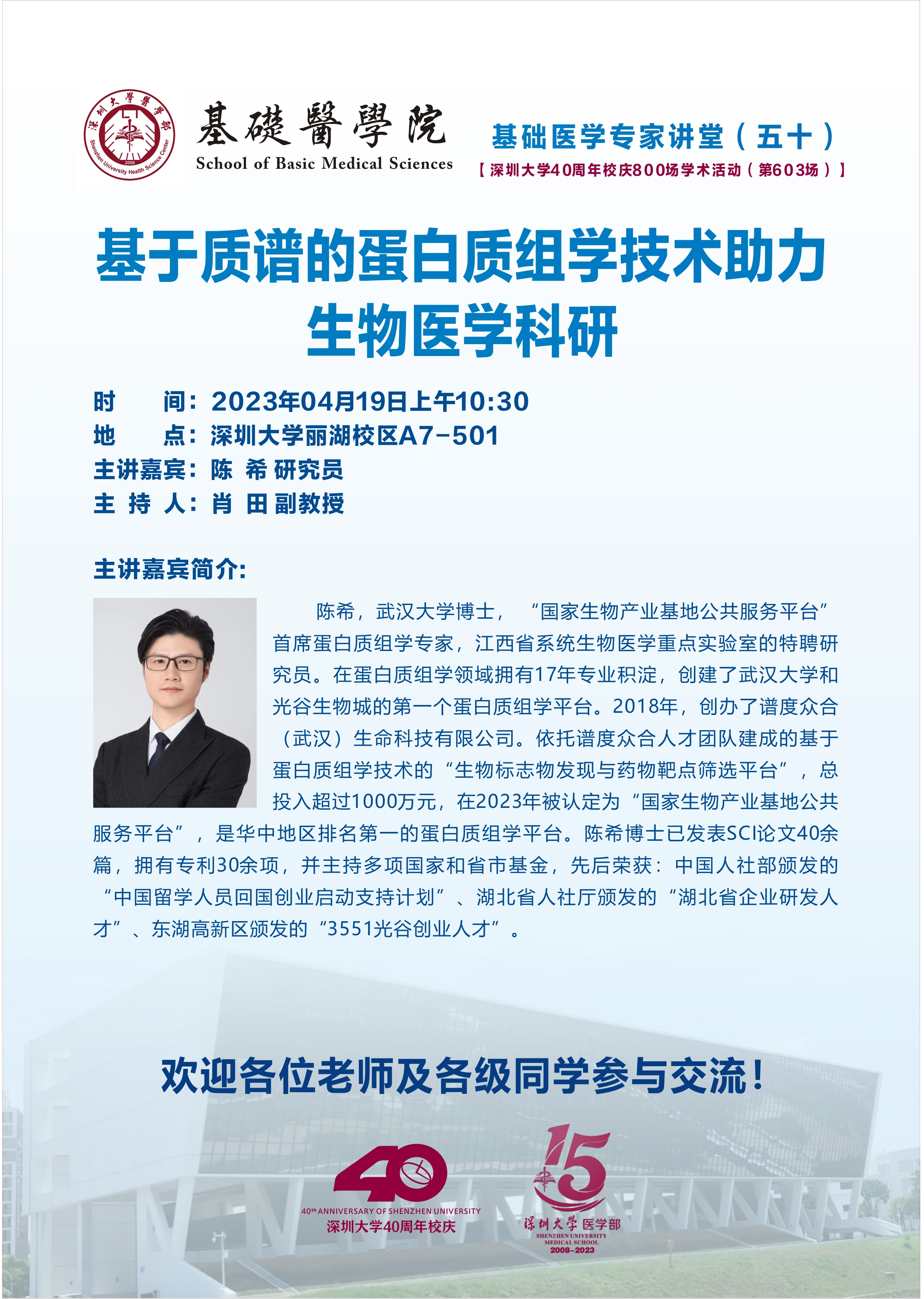 【深圳大学40周年校庆800场学术活动(第603场)+基础医学专家讲堂(五十)】:基于质谱的蛋白质组学技术助力生物医学科研