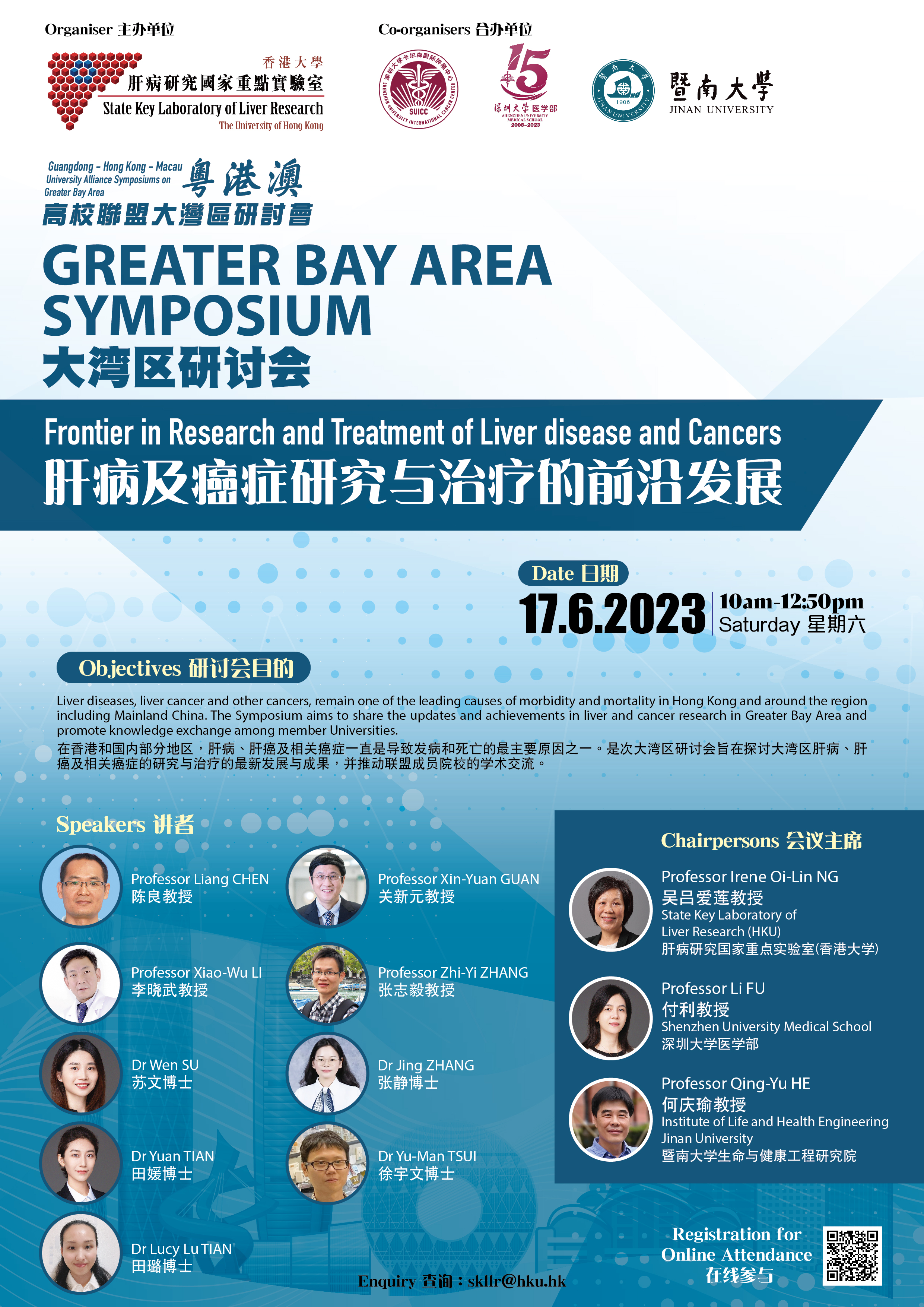 大湾区研讨会 – 肝病及癌症研究与治疗的前沿发展 发布时间:2023-06-01 点击数: 次 【字体:小 大】 时间:6月17日(周六)上午10:00-12:50,地点:深圳大学丽湖校区启明楼(中央图书馆)D101报告厅。参会免费,可线上参会(ZOOM):海报右下角二维码扫码填写信息后,会议ID和密码将在会前一周(即6月12日前)发送到填写的电子邮件。 点赞 收藏 分享到: 打印正文 关闭本页