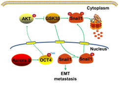 基底样型乳腺癌与三阴性乳腺癌高度类似,具有增殖活力高、抗药性强、复发率高、侵袭力和转移能力强、预后差等特征,是恶性程度最高的乳腺癌亚型,目前临床尚无有效的靶向性治疗方案。上皮-间质转化(epithelial-mesenchymal transition, EMT)能够促进癌细胞转移,并赋予肿瘤细胞干细胞特性,提高癌细胞致瘤转移能力及抗药性,在基底样型乳腺癌侵袭转移过程中起着重要作用。蛋白激酶Aurora B是细胞正常有丝分裂过程中一个重要的调控因子,因其在多种癌症中高表达引起细胞过度增殖而成为肿瘤治疗的靶点,针对其开发的多个靶向药物已经进入临床试验阶段,但均具有较强的毒副作用,因此,如何降低靶向Aurora B的毒副作用成为该领域的研究热点。本研究发现,蛋白激酶Aurora B在基底样型乳腺癌和三阴性乳腺癌中表达显著升高,其高表达与乳腺癌病人的高转移及低生存率成正相关; 敲低Aurora B表达能显著抑制基底样型乳腺癌细胞迁移和在小鼠体内的转移能力。进一步,研究人员发现Aurora B以激酶依赖的形式激活AKT信号通路,导致GSK3β激酶失活,从而稳定了EMT诱导因子Snail1的蛋白水平。此外,本研究还发现转录因子OCT4苏氨酸343位点的磷酸化对于Aurora B-AKT-GSK3β-Snail1信号轴以及EMT是必须的。用Aurora B激酶抑制剂AZD1152(已进入实体瘤Phase I临床试验)能够抑制Aurora B诱导的EMT,进而阻断基底样型乳腺癌细胞转移。该研究发现了Aurora B除调控细胞增殖之外的另外一个新功能,即调控细胞迁移和EMT,进而影响肿瘤的转移。靶向Aurora B可以抑制EMT及肿瘤转移,和传统的仅仅靶向细胞增殖的化疗药物明显不同。基于本研究结果,临床上可以靶向Aurora B的同时,联合传统化疗来治疗三阴性乳腺癌或基底样型乳腺癌,即可降低单个药物包括单独靶向Aurora B的毒副作用,提高疗效,从而为三阴性乳腺癌患者提供更安全有效的新的治疗方法。