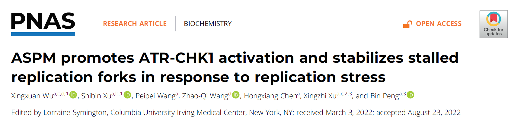 近日,球盟会QMH(中国)官方网站 许兴智教授/彭斌副教授团队在国际顶级学术期刊《Proc Natl Acad Sci U S A》发表了题为ASPM promotes ATR-CHK1 activation and stabilizes stalled replication forks in response to replication stress 的原创性研究成果。该报道揭示了ASPM作为支架蛋白促进TopBP1和RAD9在复制叉上的募集,从而促进了复制胁迫下ATR-CHK1信号轴的活化。同时,ASPM募集至阻滞的复制叉并保护新合成DNA链不被核酸酶降解,从而维持复制叉稳态的全新机制。该论文所有工作均在深圳大学完成,该团队博士生伍星璇、博士后许仕彬为共同第一作者,许兴智教授和彭斌副教授为论文的共同通讯作者。