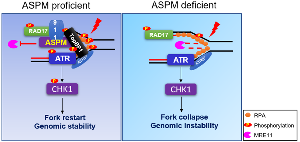 研究团队利用CRISPR-Cas9基因编辑技术构建了FLAG-ASPM knock in(KI)的细胞系,通过FLAG抗体富集的互作蛋白进行质谱鉴定,意外发现多个与DNA复制相关的蛋白。研究发现ASPM对于正常的DNA复制进程没有明显影响,但是影响复制胁迫下ATR-CHK1信号轴的激活。通过细胞和生化层面的实验证实,ASPM在RAD17的下游发挥功能。复制胁迫下ASPM被RAD17募集至阻滞的复制叉上,其N端(1-919 aa)作为平台募集TopBP1和RAD9至阻滞的复制叉,而后者是ATR激活的重要激活因子。发现复制胁迫下ASPM缺陷的细胞中阻滞复制叉上新合成DNA链被降解、阻滞的复制叉比率显著增加,而重启的叉明显减少。深入研究发现ASPM募集至阻滞的复制叉上可以拮抗核酸酶MRE11对新生链的降解。此外,还发现ASPM缺陷的细胞对复制胁迫药物羟基脲(HU)更为敏感,且显著增加了染色体畸变的比率。因此,ASPM对于复制叉稳态的维持对于后续DNA复制叉的重启和基因组稳定性的维持是至关重要的。