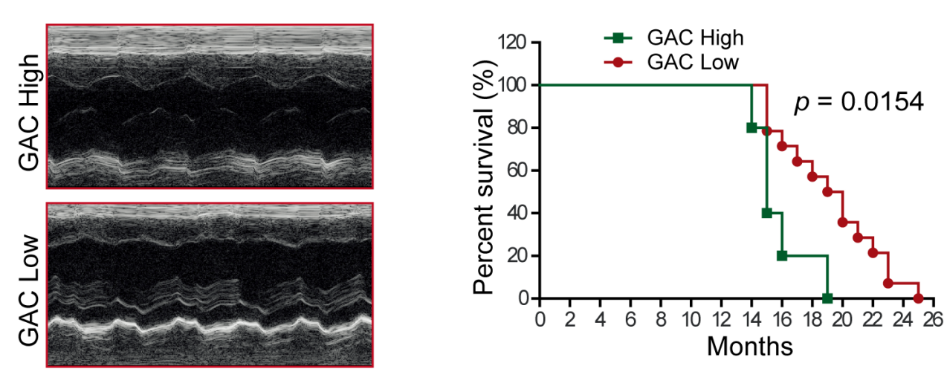 进一步分析发现,这群中年小鼠中约20%比例的小鼠GAC荧光信号高,并且这些高GAC荧光小鼠出现心脏肥大、心功能异常(图3),比低GAC荧光的小鼠寿命显著缩短(图4)。