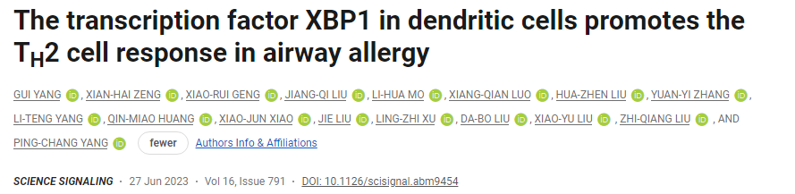 2023年6月27日,深圳大学基础医学院杨平常教授团队在Science子刊《Science Signaling》(Top)在线发表题为“The transcription factor XBP1 plays a key role in the development of The T helper 2 response”的研究论文。硕士生导师杨贵为论文第一作者,杨平常教授为该论文的通讯作者。