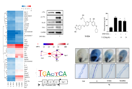 过敏性疾病是一类常见病和多发病。我国目前至少有500万以上儿童患过敏性哮喘、5000万以上过敏性鼻炎患者和3000万以上过敏性皮炎患者;全球过敏性疾病发病率和死亡率正逐年上升。过敏性疾病的发病机制及防治的转化研究具有潜在的临床应用价值。肥大细胞(Mast cell,MC)作为I型变态反应疾病的病理生理效应器,在过敏及炎症反应中起关键作用。长期以来一直寻找安全有效的靶向药物抑制肥大细胞活化用于抗过敏治疗。该团队通过RNA-seq等技术确定了IgE信号可上调肥大细胞中c-Fos基因表达。通过细胞分子生物实验揭示了AP1/Egr1/IL4信号轴参与肥大细胞活化引发过敏性疾病的致敏分子机理;并进一步探讨了c-Fos抑制剂T-5224的抗过敏的药效。结果显示T-5224能明显地抑制肥大细胞脱颗粒,并且对小鼠被动皮下致敏模型(PCA)、主动全身性致敏模型(ASA)和皮炎模型的体内过敏反应症状均有明显的抑制作用。这表明T-5224作为抗过敏药物有潜在应用价值。该研究成果申请了国家发明专利(专利申请号:202110099786.7)。该团队将继续着重研究过敏性疾病的发病机制,并努力寻找更加有效的预防及治疗手段。