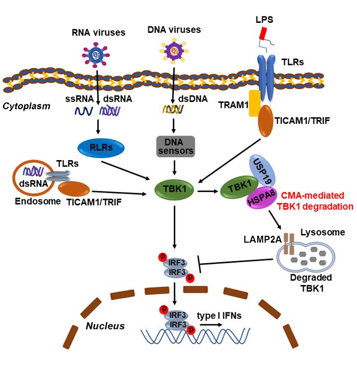 病毒感染是人类健康的重要威胁之一,天然免疫是细胞和机体抵抗病毒入侵的第一道防线。近年来随着世界各地高致病性病毒及变异株的不断出现,比如新型冠状病毒(SARS-CoV-2)肺炎疫情,给社会发展和国民经济造成了重大损失。因此,寻找抗病毒感染治疗新靶点,具有重要的潜在临床意义和社会效益。TBK1(TANK-binding kinase 1)作为抗病毒信号通路中关键的节点蛋白,对细胞抗病毒能力具有重要影响。该团队利用去泛素化酶质粒库,筛选出USP19(ubiquitin specific peptidase 19)能够促进TBK1降解,并且发现USP19促进TBK1降解并不依赖于其去泛素化酶活性。机制研究表明,USP19能够促进CMA相关基因HSPA8/HSC70和LAMP2A的表达,从而增强细胞CMA进程。此外,研究发现TBK1含有一段经典的CMA motif(KFDKQ),该motif在与HSPA8结合过程中发挥重要作用。该研究阐明了USP19通过CMA途径促进TBK1降解,从而在体内外负向调控细胞抗病毒反应,为病毒感染相关疾病的治疗提供了新的潜在靶点。