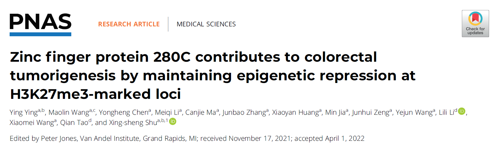 2022年5月23日,球盟会QMH(中国)官方网站 基础医学院舒兴盛/应颖团队在美国科学院院刊PNAS上发表题为“Zinc finger protein 280C contributes to colorectal tumorigenesis by maintaining epigenetic repression at H3K27me3-marked loci”的研究论文,揭示了锌指蛋白ZNF280C通过在关键癌症基因位点维持表观遗传抑制程序来促进结直肠癌发生和转移的机制。