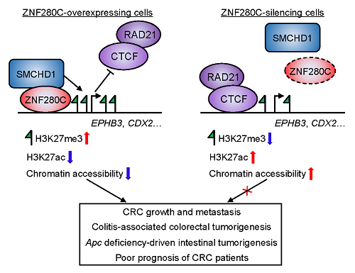 该研究发现Zfp280c(人ZNF280C的小鼠同源基因)对于化学诱导的炎症相关结直肠癌和抑癌基因Apc缺乏所驱动的小鼠肠道肿瘤的发生都是必需的。与之一致的,人类CRC细胞中的ZNF280C沉默抑制了细胞的增殖、克隆形成以及迁移能力,并阻滞了异种移植肿瘤的生长及肝转移。作为一个含有C2H2(Cys2-His2)锌指结构域的转录因子,ZNF280C可以结合到染色质状态迥异的基因组区域,并且其结合位点与染色质调节因子CTCF/Cohesin高度重合。值得关注的是,ZNF280C对组蛋白H3第27位赖氨酸的三甲基化(H3K27me3)标记基因的转录抑制以及维持焦点和全局的H3K27me3水平都至关重要。机制上,ZNF280C通过招募表观遗传抑制因子SMCHD1拮抗CTCF/Cohesin的活性,并导致某些被H3K27me3标记的抑癌基因顺式元件染色质环境的紧缩。最后,作者发现ZNF280C在原发性CRC和多个器官的CRC远处转移灶中高表达,且较高的ZNF280C水平强烈预示CRC患者预后较差。综上,该研究发现了一个结直肠癌病理发生过程中的新分子,并为DNA结合的转录因子通过协调染色质调节分子的活性以控制基因转录提供了机制见解。