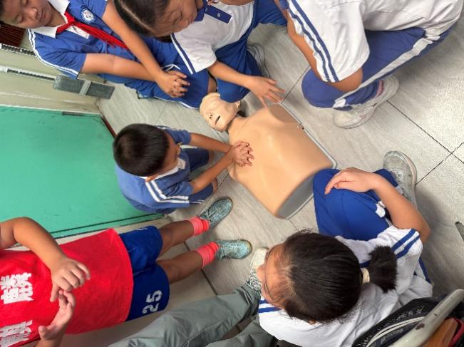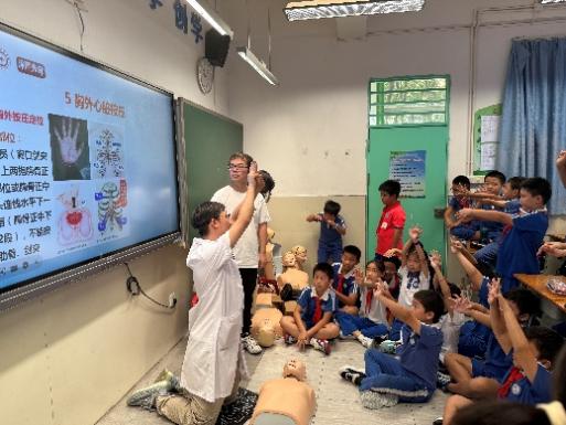 急救知识技能环节,马景涛以真实数据切入,强调“黄金4分钟”对心搏骤停患者的重要性。他现场系统演示了环境评估、意识判断、呼救方法、胸外按压、人工呼吸等完整心肺复苏流程,介绍了AED的使用方式。闫佳伟、欧阳淇、陈丽叶三位志愿者协助同学们分组进行模拟练习,他们手把手指导胸外按压的正确手法,讲解按压深度和频率的要点,掌握“用力压、快快压、胸回弹、少中断”的操作要领,并指导人工呼吸的规范操作。针对小学生的年龄特点,志愿者们特别调整了教学方式,使用更易理解的表达方式传授急救知识。