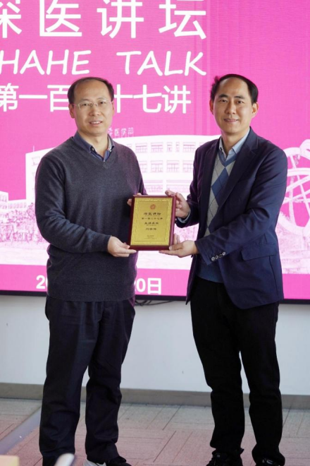 Professor Peng Huang presented Professor Xuehai Yan with the "Shenzhen University Medicine Forum" Honorary Medal