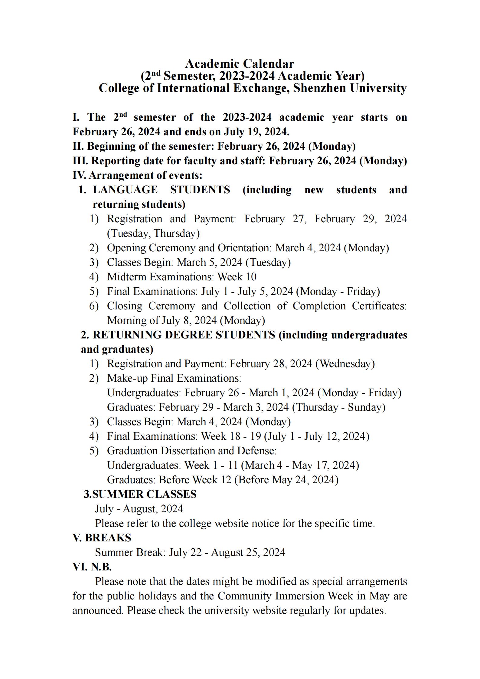 Academic Calendar (2nd Semester, 2023-2024 Academic Year) Date:2024-01-11 14:18:56 Hits: times [Font size: Small Large]