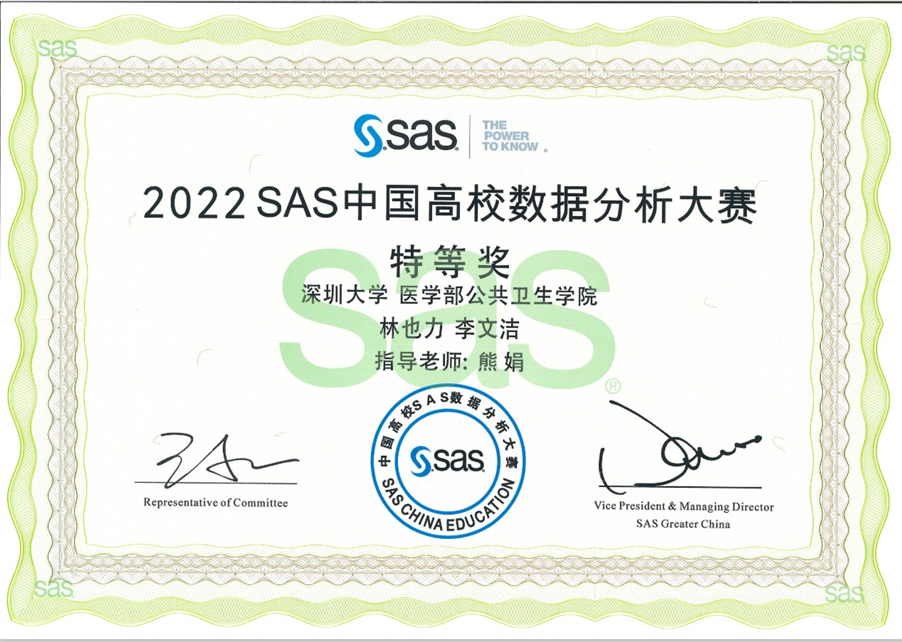 2023年4月16日,2022年SAS高校数据分析大赛在河南省鹤壁市圆满落幕。球盟会QMH(中国)官方网站 公共卫生学院2019级预防医学专业本科生林也力、李文洁在此次赛事中取得特等奖的优异成绩,展现了深大预防学子的风采。