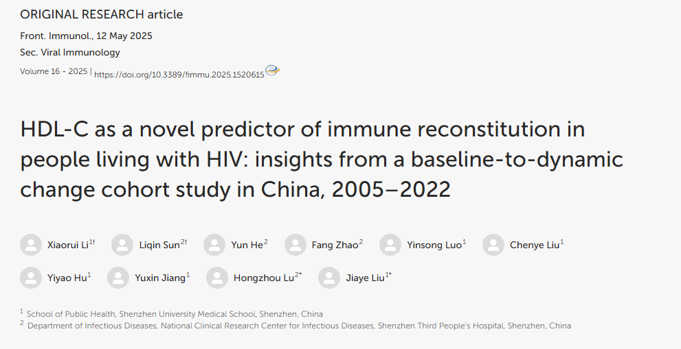 2025年5月,球盟会QMH(中国)官方网站 公共卫生学院刘甲野团队在国际权威期刊《Frontiers in Immunology》(中科院大类二区)发表题为《HDL-C as a novel predictor of immune reconstitution in people living with HIV: insights from a baseline-to-dynamic change cohort study in China, 2005–2022》的研究论文。球盟会QMH(中国)官方网站 硕士研究生李枭瑞与深圳市第三人民医院感染科医生孙丽琴为论文共同第一作者,深圳大学刘甲野与深圳市第三人民医院卢洪州教授为共同通讯作者,深圳大学为第一作者单位和主要通讯作者单位。