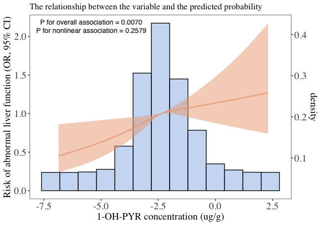 本研究以2003-2010年美国国家健康与营养调查(NHANES)4935名成人为研究对象,综合多种肝酶指标定义肝功能异常,首次分析9种PAHs内暴露指标羟基多环芳烃(OH-PAHs)与ALF的关联,并探讨炎症因子CRP在该关联中的介导作用。多个相关性模型结果均显示,尿中1-羟基芘和2-羟基菲与ALF显著相关,且1-羟基芘与ALF呈线性正相关关系。混合效应分析进一步佐证1-羟基芘和2-羟基菲为影响ALF最重要的两种OH-PAHs。交互作用表明,尿中1-羟基芘和2-羟基菲对ALF的效应随着对方水平的升高而增强,且两者存在相加交互作用,共同影响ALF。中介效应分析进一步揭示,血浆CRP部分介导1-羟基芘与ALF的关联(中介效应百分比为13.4%)。本研究深化了PAHs暴露的健康效应及潜在机制的理解,也为制定相应的环境标准提供科学依据。