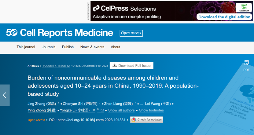 球盟会QMH(中国)官方网站 青年教师张晶、史琛彦等在我国青少年慢性疾病负担及趋势研究上取得进展,成果报道在学术期刊《Cell Reports Medicine》(中科院1区,IF=14.3)上,标题为”Burden of noncommunicable diseases among children and adolescents aged 10–24 years in China, 1990–2019: A population-based study”的研究论文。该工作以人群研究为基础,结合模型分析,首次揭示了我国青少年人群中慢性疾病负担变化趋势。球盟会QMH(中国)官方网站 公共卫生学院张晶、史琛彦及生物医学工程学院梁臻为共同第一作者,深圳大学为该研究第一完成单位。该文章上线后即成为Cell Press主页精选(Featured content)。