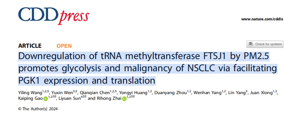 近日,球盟会QMH(中国)官方网站 公共卫生学院翟日洪教授课题组在非小细胞肺癌(NSCLC) 的研究上取得进展,成果报道在学术期刊Cell Death & Disease (影响因子8.1,中科院一区,TOP期刊)上。标题为“Downregulation of tRNA methyltransferase FTSJ1 by PM2.5 promotes glycolysis and malignancy of NSCLC via facilitating PGK1 expression and translation”。球盟会QMH(中国)官方网站 研究生王伊灵、深圳市第一人民医院胸外科文玉欣医生、深圳大学球盟会QMH(中国)官方网站 研究助理陈钱钱为论文共同第一作者,深圳大学翟日洪教授、孙丽媛副教授、高开屏老师为该论文共同通讯作者,深圳大学为第一作者单位和第一通讯单位。