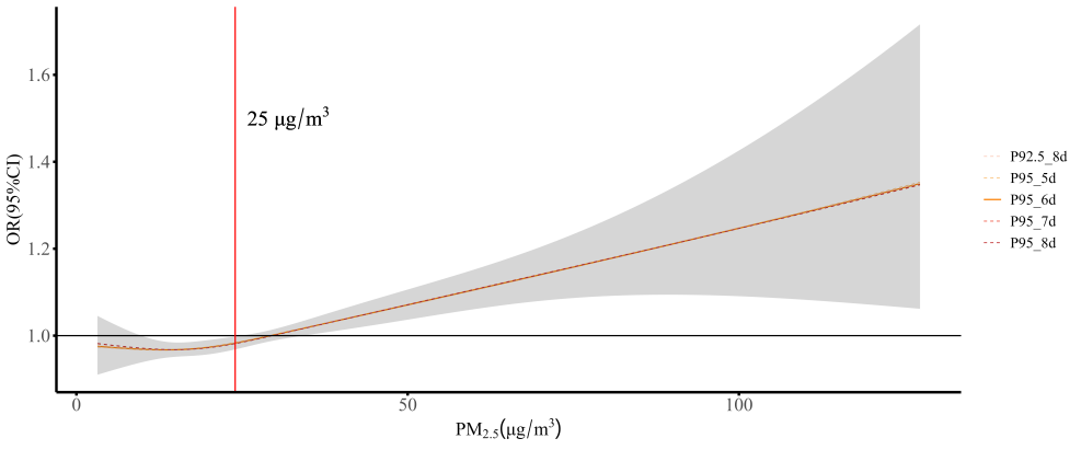 暴露于较高温度阈值与较长持续时间的热浪(P92.5_8d、P95_5d、P95_6d、P95_7d和P95_8d)可增加心血管疾病的死亡风险,ORs(95% CI)的范围约为1.17(95%CI: 1.001, 1.36)到1.91(95% CI: 1.42, 2.56) 之间(图1)。在校正了热浪的影响后,PM2.5与心血管疾病死亡的暴露-反应关系曲线大致呈线性趋势,随PM2.5浓度增加,CVD死亡风险也不断增加(图2)。