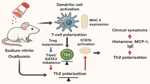 亚硝酸钠作为食品防腐剂被广泛使用,但其对食物过敏发病机制的免疫调节作用仍知之甚少。本论文通过小鼠食物过敏模型,探讨了亚硝酸钠暴露如何影响树突状细胞(DCs)介导的致敏作用及T细胞极化。结果显示,亚硝酸钠暴露加剧了过敏反应,表现为临床症状加重、体重增长减缓,以及血清组胺、MCP-1和IgE水平升高。亚硝酸钠可增强抗原摄取能力、上调MHC II表达,并选择性激活MAPK(p-JNK/ERK1/2)和STAT6通路,从而放大Th2细胞因子产生和IgE类别转换。从机制上看,亚硝酸钠通过T-bet/GATA3失衡、Treg细胞抑制和DC活化增强促进了Th2极化。结果表明,亚硝酸钠可能通过协同调控DC功能、Th2极化和免疫调节机制破坏免疫稳态,凸显了亚硝酸钠通过多重免疫调节途径加剧食物过敏的潜在风险。