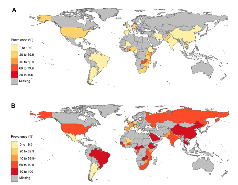 全球儿童和青少年HIV-1感染者初治(A)及经治(B)耐药率