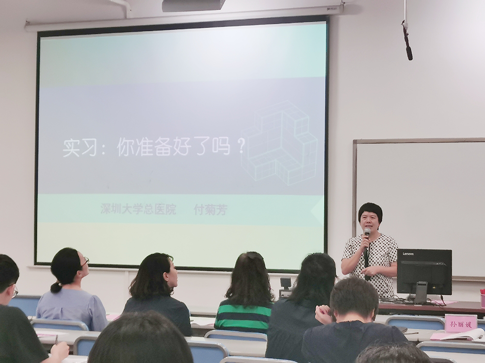 深圳大学总医院护理部付菊芳主任以“实习:你准备好了吗?”为题进行实习动员讲话,希望同学们在实习期间能制定明确的目标、有效进行时间管理以及具备良好的学习态度。同时,要不断增强自己的责任意识和安全意识,在实际工作中锻炼自己,提升自身综合素质。