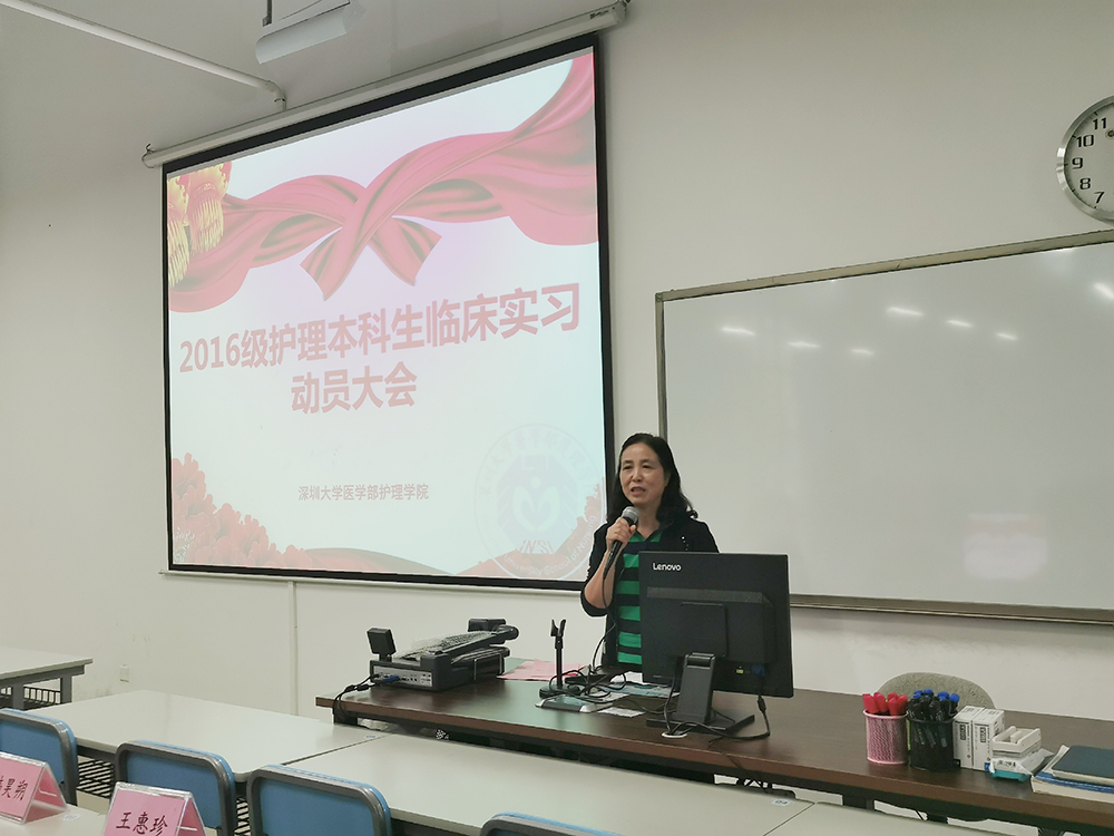 深圳大学护理学院首批(2016级)护理本科生即将奔赴临床实习,为了让同学们更好的了解临床实习,提高同学们对实习的热情,帮助同学们在实习中展现良好的精神风貌,护理学院于7月10日下午在A6教学楼301教室召开了2016级护理本科生临床实习动员大会。出席本次会议的有护理学院王惠珍院长、孙丽媛副院长、总医院护理部付菊芳主任、球盟会QMH(中国)官方网站 学工办韩昊朔老师、球盟会QMH(中国)官方网站 人才培养办公室吴文宙老师、2016级护理专业各班班主任及2016级全体学生。会议由护理学院方淇玉老师主持。