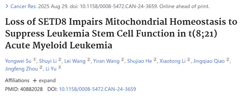 2025年8月29日,深圳大学卡尔森国际肿瘤中心、深圳大学总医院血液肿瘤科于力教授与周景峰助理教授合作在肿瘤学Top期刊《Cancer Research》 (IF =16.6, Nature Index杂志)上发表了题为“Loss of SETD8 Impairs Mitochondrial Homeostasis to Suppress Leukemia Stem Cell Function in t(8;21) Acute Myeloid Leukemia”的研究论文。该研究发现靶向表观遗传组蛋白甲基转移酶SETD8可以有效杀伤t(8;21)急性髓系白血病干细胞,为克服t(8;21)急性髓系白血病复发及耐药提供了新的靶标及靶向干预新策略。已出站博士后苏永伟为第一作者,于力教授为最后通讯作者,周景峰助理教授为共同通讯作者。深圳大学总医院血液肿瘤科李舒宜、王蕾、王怡然、贺淑娇、乔静巧,已毕业硕士生李晓彤共同参与了本研究,深圳大学为第一完成单位。