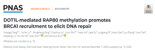 2024年8月,球盟会QMH(中国)官方网站 卡尔森国际肿瘤中心朱卫国教授团队在PNAS杂志上发表题为“DOT1L-mediated RAP80 methylation promotes BRCA1 recruitment to elicit DNA repair”的研究论文,揭示了DOT1L介导RAP80的甲基化在BRCA1-A复合物招募到染色质以进行DNA损伤修复的关键作用。球盟会QMH(中国)官方网站 博士后唐璜琦与博士生吕亚霏为本研究的共同第一作者,朱卫国教授和朱骞助理教授为共同通讯作者。