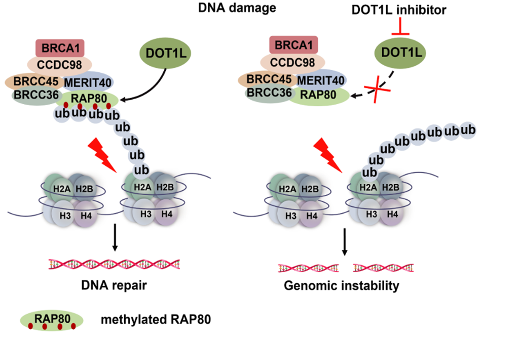 本研究证实了DOT1L在DNA损伤修复过程中起着关键的作用。研究结果表明,当发生DNA双链断裂,DOT1L被招募到染色质上,与RAP80直接相互作用,并对RAP80的多个赖氨酸位点进行甲基化。甲基化的RAP80是与泛素化的H2A结合的必要条件,这一过程随后会促进BRCA1-A复合物招募到染色质上进行DNA损伤修复。初步的临床数据支持DOT1L表达水平与接受放疗的癌症患者的总生存率之间存在相关性。通过敲除或利用抑制剂EPZ5676抑制DOT1L的活性,可以提高肿瘤细胞对放疗的敏感性,在临床上是具有有很大潜能的治疗策略(具体工作模式图如下)。