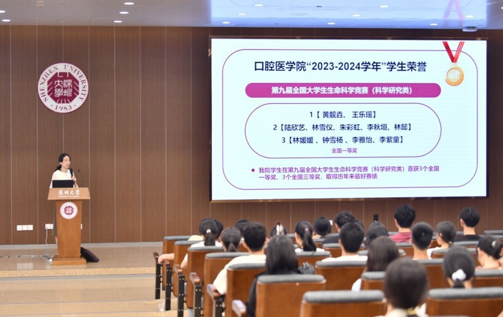 随后,孟贺向2024级新生详细介绍了学院的概况,包括学院发展历程、教学条件、师资力量、学生培养情况等方面。她表示,深大口腔有着全国一流的教学实验室,有着优秀年轻化的教师团队,有着业界权威的专家学者支持,学院一切从学生出发,着力于为学生提供良好的学习环境,希望2024级的新生可以在深大口腔打下坚实基础。