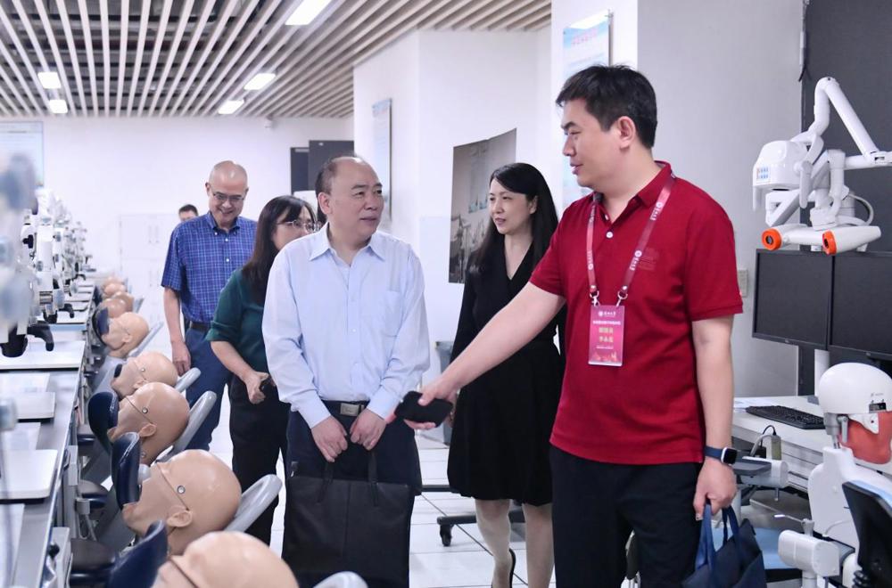 口腔医学副院长沙鸥对专家组的到来表示热烈的欢迎,简要介绍了口腔医学专业概况,带领专家组考察了口腔临床技能实训室、仿真头模实训室、虚拟仿真实训室、口腔机器人实训室和口腔科学展示馆,讲述现代智慧口腔医学实验教学模式与教育教学的融合,为培养口腔医学创新复合型人才保驾护航。