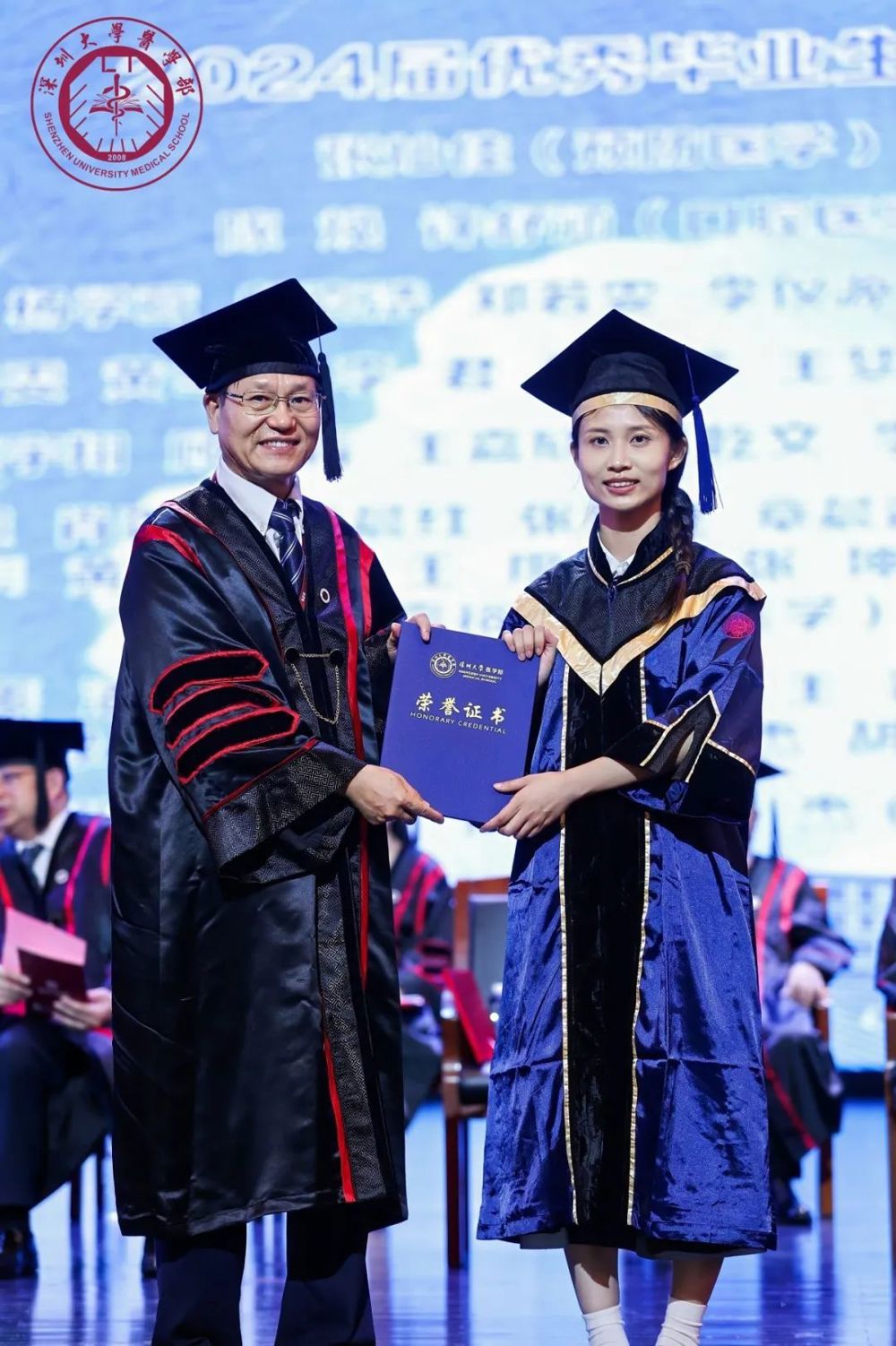 在毕业典礼上,张学记副校长与球盟会QMH(中国)官方网站 领导共同为优秀毕业生颁发了荣誉证书,以表彰他们在校期间的卓越表现。口腔医学院2019级口腔医学专业的陈焕、许舒涵、谢和蓁、张锐怡、刘小婷等五位同学被评为优秀毕业生。