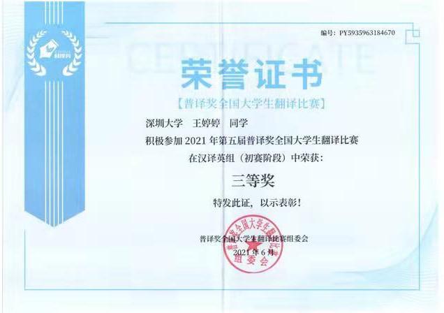 喜讯!我院2020级学生王婷婷在第五届普译奖全国大学生翻译比赛中获奖 发布时间:2022-12-01 17:20:54 浏览次数: 次 【字体:小 大】 口腔近日,我院2020级学生王婷婷在2021年第五届普译奖全国大学生翻译比赛的汉译英组(初赛阶段)中荣获三等奖!特此祝贺! 点赞 收藏 分享到: 【打印正文】