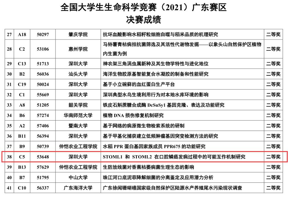喜讯!我院2019级学生许舒涵、谢和蓁、李阳之、张九龄在全国大学生生命科学竞赛中获奖 发布时间:2022-12-01 17:21:31 浏览次数: 次 【字体:小 大】 口腔2021年9月5日,我院2019 级学生生许舒涵、谢和蓁、李阳之、张九龄的项目《STOML1和STOML2在口腔鳞癌发病过程中的可能互作机制研究》在全国大学生生命科学竞赛(2021)广东赛区决赛中获二等奖。 点赞 收藏 分享到: 【打印正文】