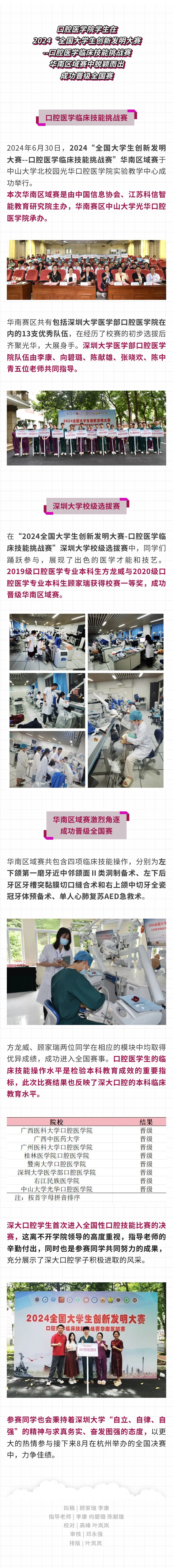 口腔医学院学生在2024全国大学生创新发明大赛——口腔医学临床技能大赛华南区域赛中喜获佳绩 发布时间:2024-07-11 11:09:16 浏览次数: 次 【字体:小 大】 点赞 收藏 分享到: 【打印正文】