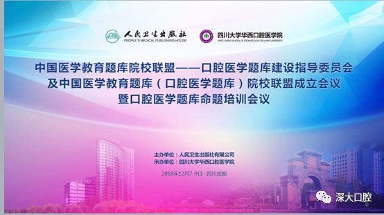 2018年12月8日,由人民卫生出版社有限公司主办、四川大学华西口腔医学院承办的《人民卫生出版社中国医学教育题库院校联盟——口腔医学题库建设指导委员会及中国医学教育题库(口腔医学题库)院校联盟成立会议暨口腔医学题库命名培训会议》在四川成都召开。