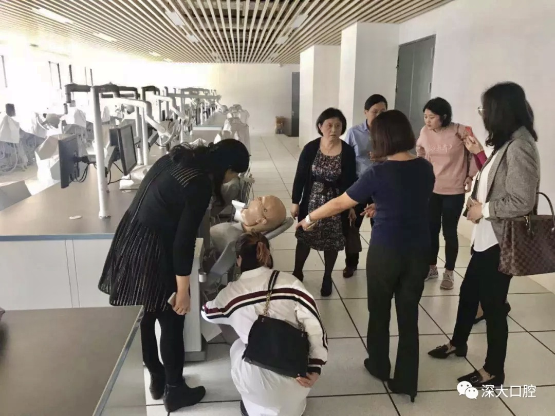 北京大学深圳医院专家们在我院副院长沙鸥教授的热情接待下,参观了口腔虚拟现实训练室、口腔临床技能实训室、仿真头模实训室、牙科机器人实训室、口腔临床前实训室等,与此同时,双方人员围绕口腔医学教学实验室设计、建设、施工等问题进行了深入交流,到访专家对于我院引进的口腔教学仿真头模及双向互动系统、数字化虚拟仿真牙医培训系统、牙科机器人实习系统等给予了高度评价。